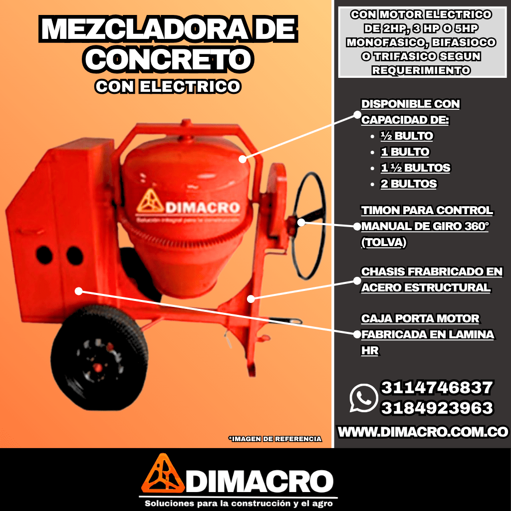 La mezcladora para concreto eléctrica, revolvedora o trompo de concreto, esta diseñada para la obtención de una mezcla homogénea en un menor tiempo con relación al mezclado tradicional es utilizado en obras de construcción de todo tipo donde se necesite un mezclado perfecto del concreto o mortero. posee una tolva (trompo) la cual en su interior está compuesta por un sistema de 6 aspas ubicadas de forma estratégica para la obtención de una mezcla perfecta en corto tiempo, el chasis está fabricado en acero estructural para dar un mejor ajuste a todo el conjunto, una caja porta motor fabricada en lámina HR.