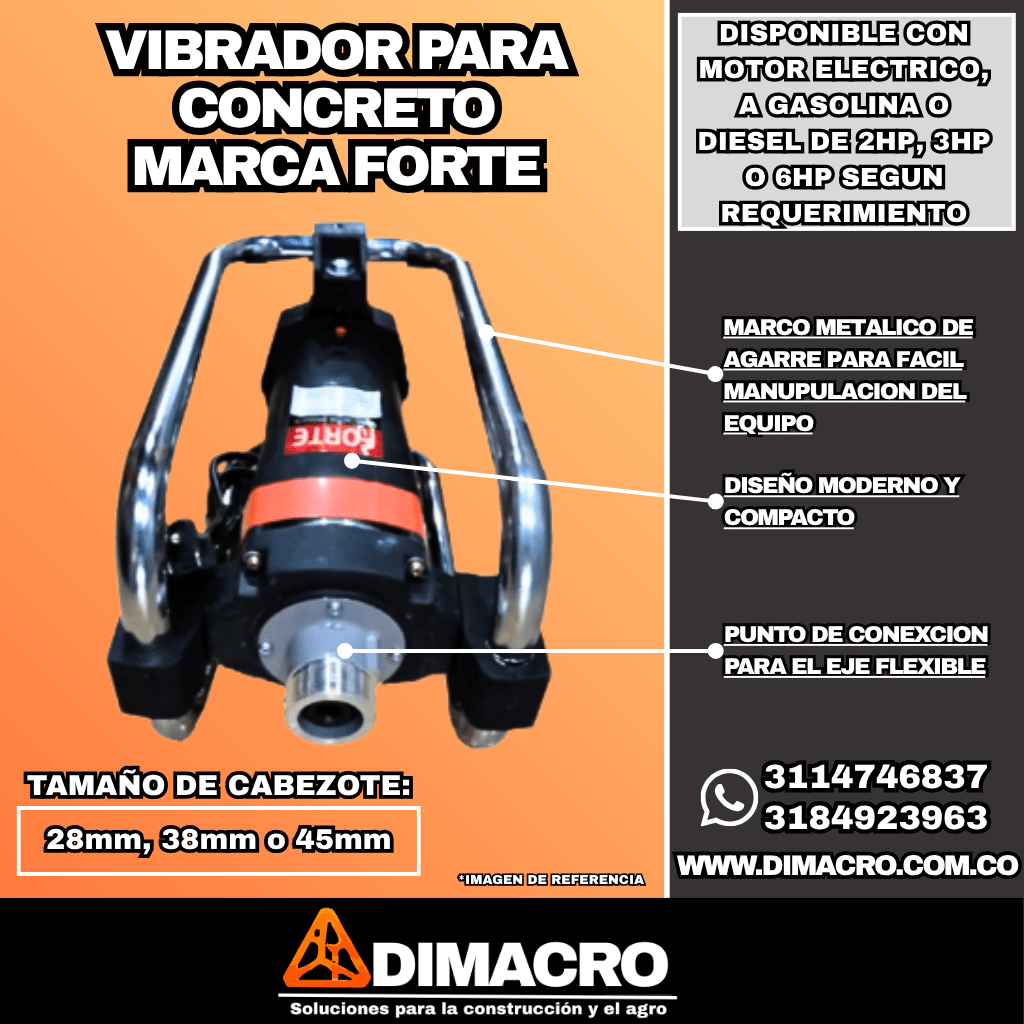 Un vibrador de concreto es una herramienta utilizada para compactar y consolidar el concreto recién vertido en una estructura, lo que ayuda a eliminar las bolsas de aire y aumenta la densidad del concreto. El vibrador consiste en un motor eléctrico o de gasolina que impulsa un eje flexible con una cabeza vibratoria en la parte superior. La cabeza vibratoria se coloca en el concreto fresco, lo que provoca vibraciones de alta frecuencia que se transmiten al concreto y ayudan a compactarlo.