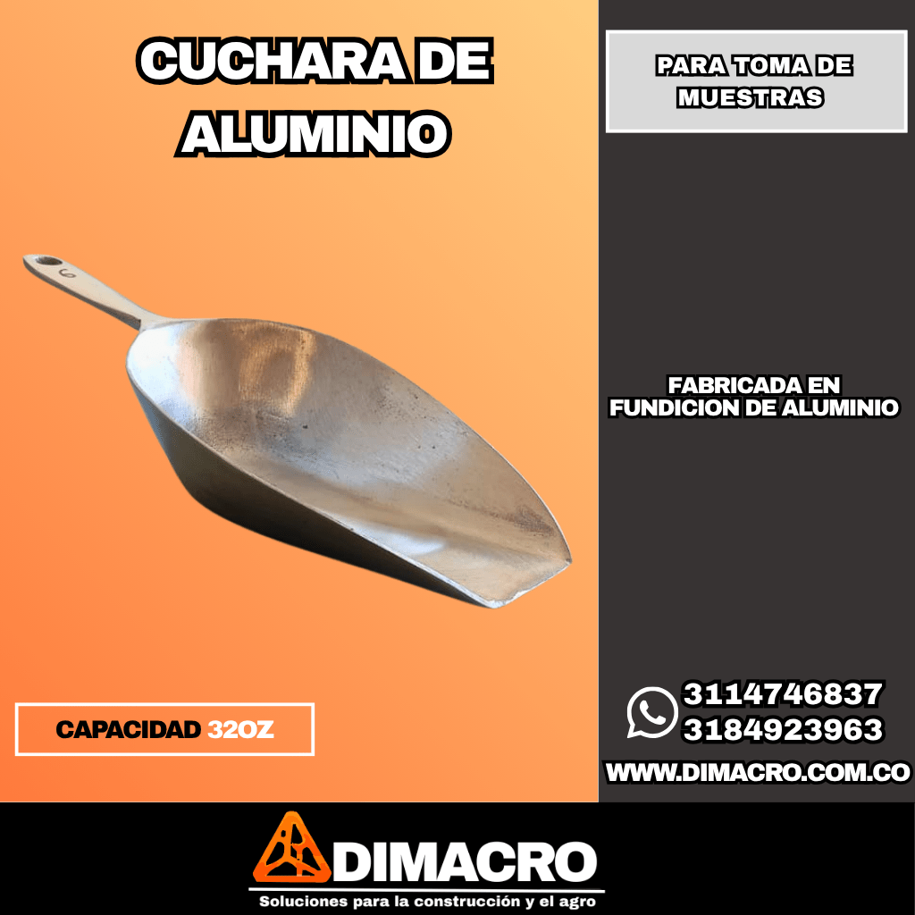 La cuchara de aluminio es utilizada para realizar de manera eficiente la toma de muestras de concreto tanto para ensayos como para pruebas de asentamiento, nuestras cucharas son elaboradas en fundición de aluminio lo cual garantiza peso ligero y excelente resistencia al desgaste,